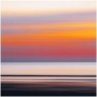 A dreamy, abstract depiction of a coastal sunset with vibrant, warm hues and a blurred horizon.