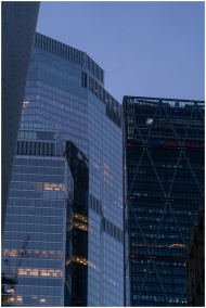 Modern skyscrapers reflecting the city lights in London's financial district.