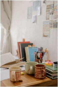 A cozy desk setup with books, stationery, and tea mugs, ideal for studying and working.