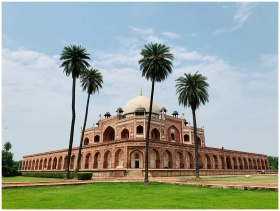 Stunning view of Humayun's Tomb in Delhi, surrounded by tall palm trees against a blue sky.