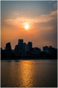 Captivating sunset view over the Shanghai skyline reflecting on Huangpu River.