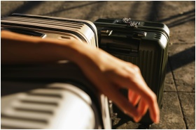 Photograph of a person's hand resting on luggage under sunlight on pavement.