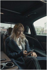 Professional woman in luxury car using smartphone, depicting busy lifestyle.