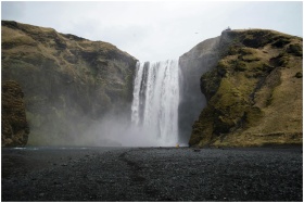 Explore the stunning Skógafoss waterfall in Iceland, surrounded by moss-covered cliffs and black sand.