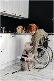 A woman in a wheelchair smiles while petting a tabby cat in a modern kitchen.