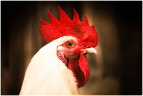 Vibrant close-up of a white Leghorn rooster with a red comb against a dark background.