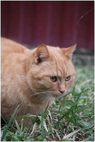 A detailed portrait of an orange cat crouching on green grass, captured outdoors.