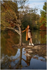 A woman with red hair standing by a pond reflects autumn's beauty in İstanbul.