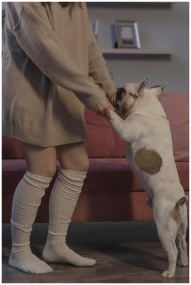 A woman in a brown sweater dances with her French bulldog in a cozy home setting, showcasing a playful bond.