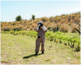 A beekeeper in a protective suit standing in a sunny field amidst dry grass and agave plants.