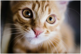 A cute tabby kitten with vivid eyes and soft fur looking directly at the camera.