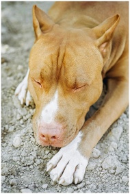 A pitbull dog peacefully sleeping on gravel, showc