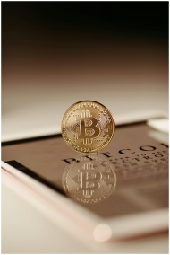 Close-up view of a Bitcoin coin reflecting on a ta