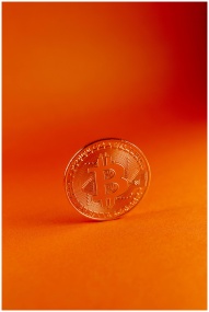 A bitcoin coin standing against a vibrant orange b