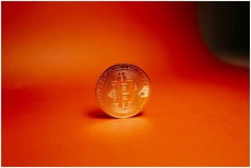 Close-up of a gold Bitcoin coin on a bright orange background, representing cryptocurrency.