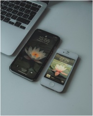 A laptop and two smartphones resting on a minimali