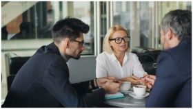 Professional team discussing ideas over coffee in