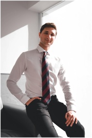 Young man in formal business attire sitting confidently, illuminated by bright natural light.