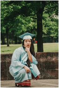 Asian woman in graduation attire poses outdoors, e