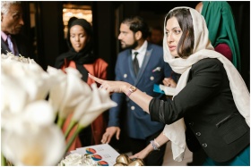 Business professionals having a discussion with charts and flowers visible on the table.
