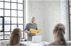 Focused aged gray haired bearded male speaker in casual wear presenting ideas to colleagues in conference room at meeting while standing at table with laptop