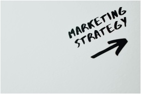 Close-up of handwritten 'Marketing Strategy' text with an arrow on white background.