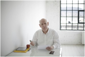 Mature businessman analyzing documents at a modern office desk during daytime.