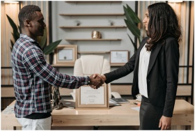 Two professionals shaking hands in an office, symbolizing a successful business agreement.