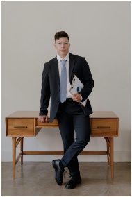 Confident businessman in a black suit leaning on a wooden desk indoors.