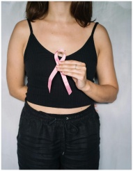 Woman holding a pink ribbon to symbolize breast cancer awareness, against a neutral background.