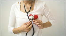 Unrecognizable female wearing white shirt while standing on white background with diaphragm of stethoscope on red handmade heart in room