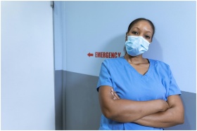 Nurse in blue scrubs and face mask in hospital corridor with emergency sign.