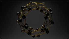 3D abstract geometric structure with gold lines and black polygons on a dark background.