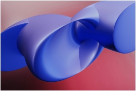 A dynamic abstract 3D blue shape on a warm gradient background.
