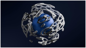 3D illustration of a blue sphere enclosed in a dynamic perforated shell on a dark background.