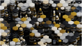 Vibrant 3D abstract hexagonal pattern with gold, white, and black geometric layers.