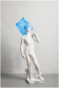 A classical nude sculpture adorned with a blue plastic bag, blending art with environmental themes.