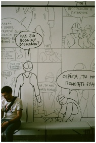 Illustrated comic wall with a man sitting and usin