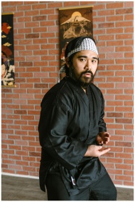 Adult martial artist posing in traditional black attire against a brick wall in a dojo setting.
