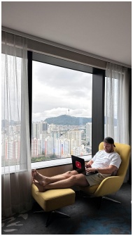 Man working on a laptop in a hotel room with a view of Seoul's skyline and Namsan Tower.