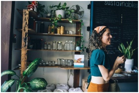 A smiling woman with a bandana in a sustainable store surrounded by plants and wooden shelves.