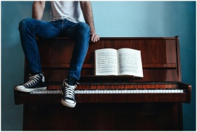Crop unrecognizable male in trendy gumshoes and jeans sitting on piano with sheet music in classroom
