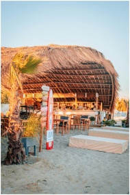 A luxurious tropical beach bar with palm trees and
