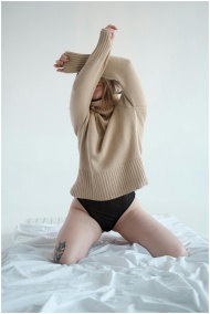 Young unrecognizable female in panties and sweater kneeling on crumpled bed and covering face with raised arms