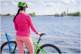Back view of a woman cyclist by a lake enjoying the outdoors on a sunny day.
