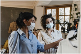 Two women browse clothing racks while wearing face masks inside a trendy boutique.