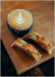 A close-up of a cappuccino with latte art and pastry on a wooden board, perfect for breakfast visuals.