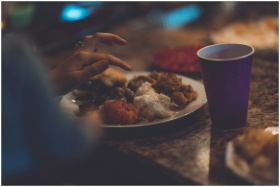 Close-up of a hand reaching for delicious food on