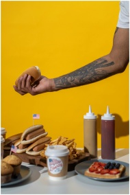 Assorted American fast food items including hot dogs with a patriotic theme on a yellow background.