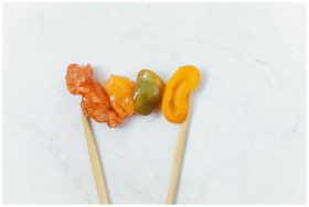 Vibrant skewer of Asian food with vegetables and chicken on a marble surface.